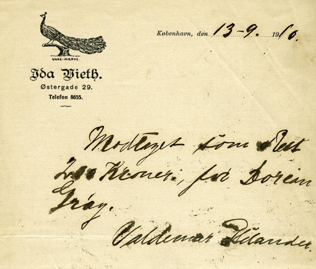 Gagekvittering for Psilanders allerførste filmrolle i Dorian Grays Portræt (Regia Kunstfilm, 1910) (DFI Udklipsarkiv).