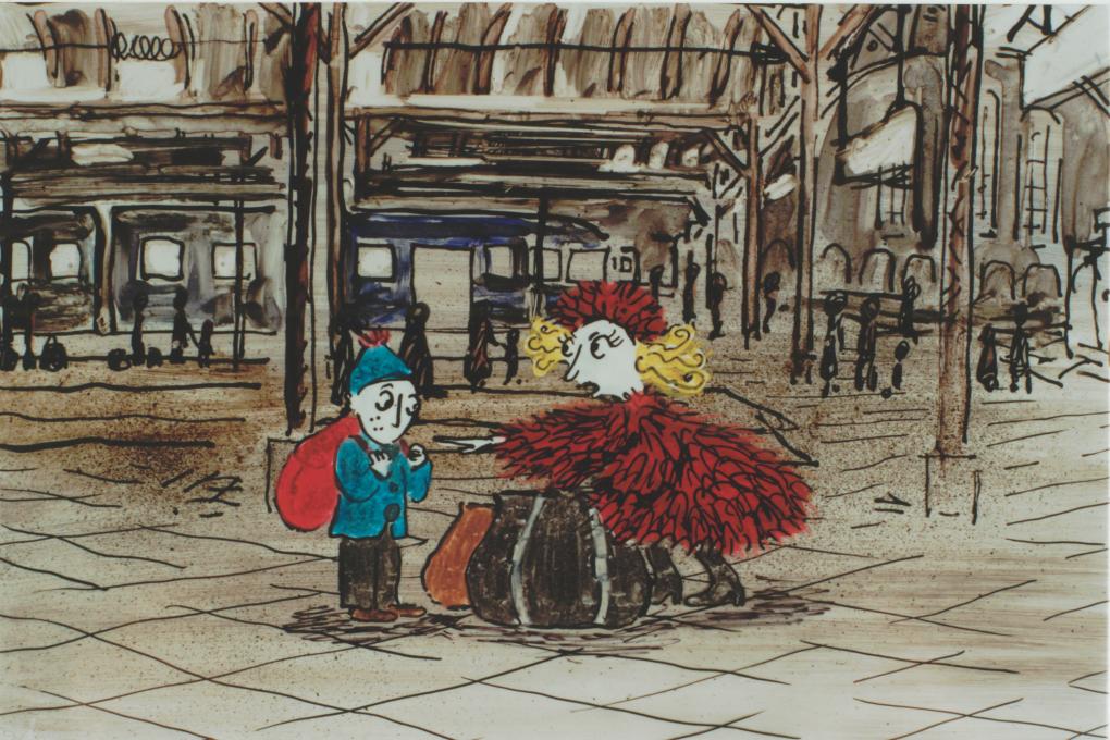 Ernst og mor skal med toget ud af byen på en lille ferie. Inde i toget finder mor deres pladser, og Ernst går ud på gangen og kigger ud af vinduet. Toget standser ved en station, og på perronen får Ernst øje på en vaffelbod. Han løber tilbage til sin kupé – men mor er væk. Ernst ser pludselig mor på perronen. Ernst stiger af toget for at finde sin mor.