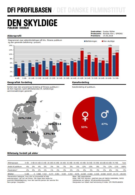I publikumsprofilen på de enkelte titler finder du grundlæggende demografiske oplysninger om filmens publikum, f.eks. køn og aldersfordeling, samt den geografiske fordeling af publikum.